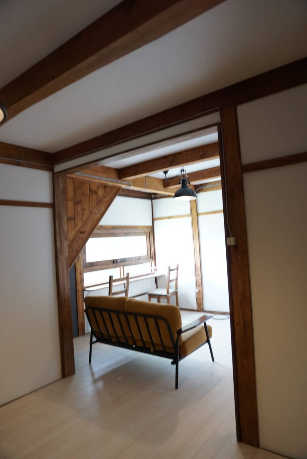 日本家屋古来の土壁、太い梁や柱、畳間や縁側。